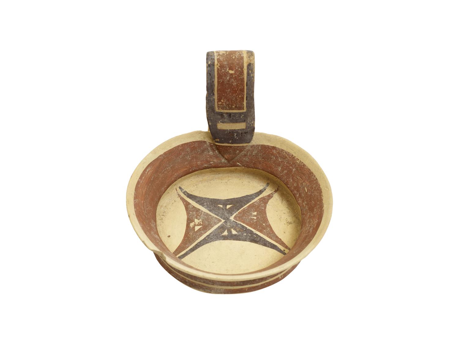 DECORAZIONE: la superficie del vaso è interamente decorata con fasce in bruno e paonazzo alternate al centro della vasca, quattro triangoli contrapposti bruni e paonazzi; sul fondo fasce tre cerchi concentrici e motivo a croce