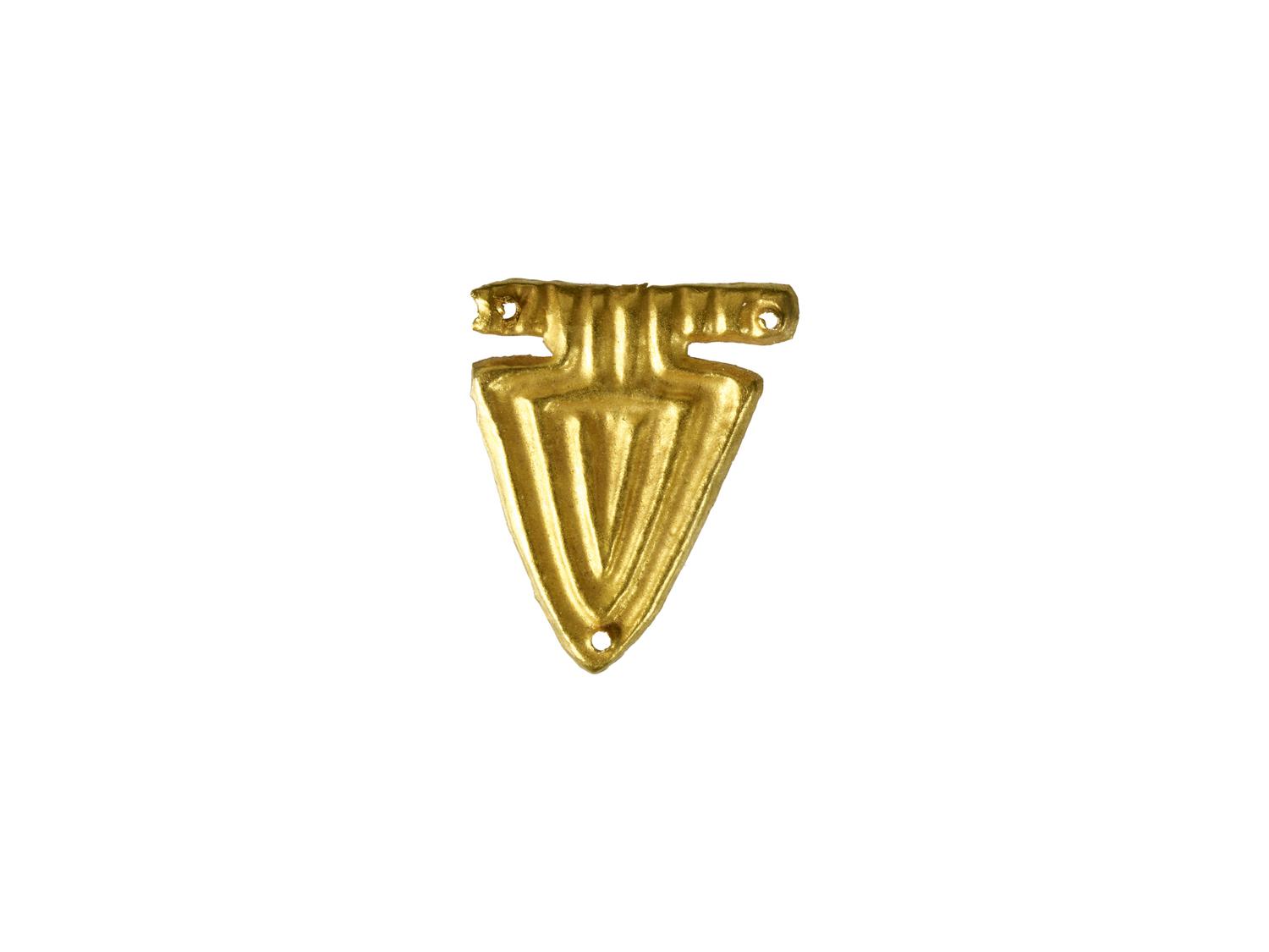Elemento decorativo, probabilmente pertinente ad un abito di forma triangolare con un elemento orizzontale sul lato minore; la superficie è decorata a sbalzo con nervature in rilievo; tre piccoli fori alle estremità destinati al fissaggio sulla stoffa