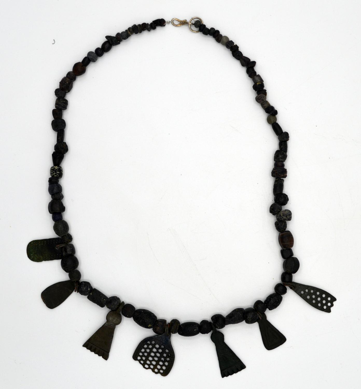 Collana con vaghi in pasta vitrea color ambra e sette pendenti in lamina di bronzo traforato.