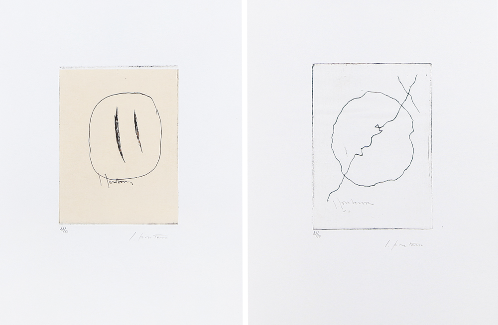 LUCIO FONTANA Rosario Santa Fe' (Argentina) 19/02/1899 - Varese 06/11/1968 Ode a Lucio Fontana, 1962 cartella contenente poesie di Leonardo Sinisgalli e 2 acqueforti su carta cm. 35,5x25,5; esemplare 22/50, incisioni firmate Lucio Fontana in basso a destra, Edizioni Bucciarelli (AN).