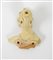 Parte superiore di statuetta: si conserva una testa femminile stilizzata stante in posizione frontale; il volto è dominato dai grandi occhi globosi applicati e dal naso aquilino, le sopracciglia sono evidenziate da linee incise, al collo una collana.