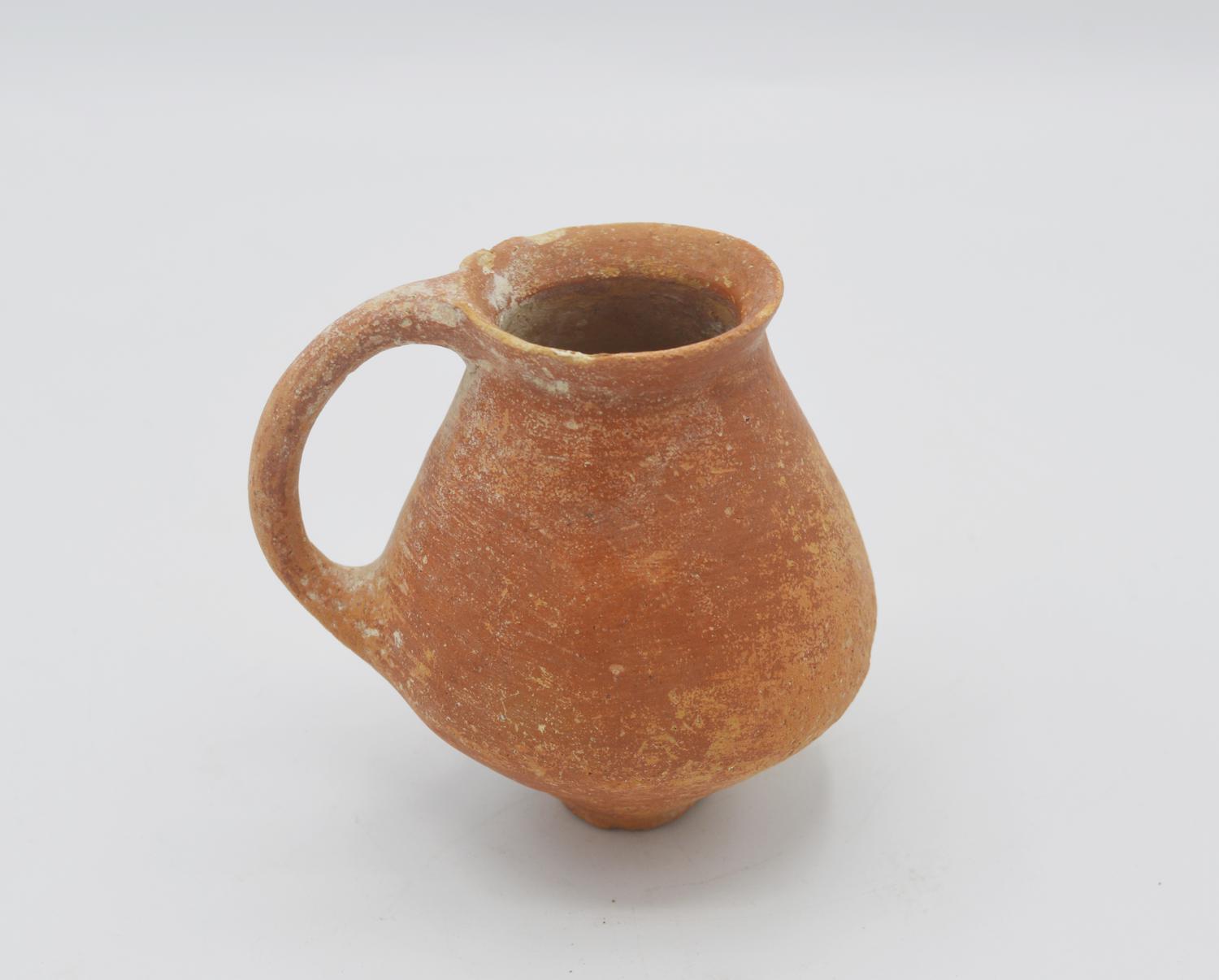 Brocchetta con orlo ingrossato e bocca circolare, breve collo cilindrico, corpo piriforme, fondo piatto; ansa a nastro impostata dall'orlo alla spalla.