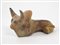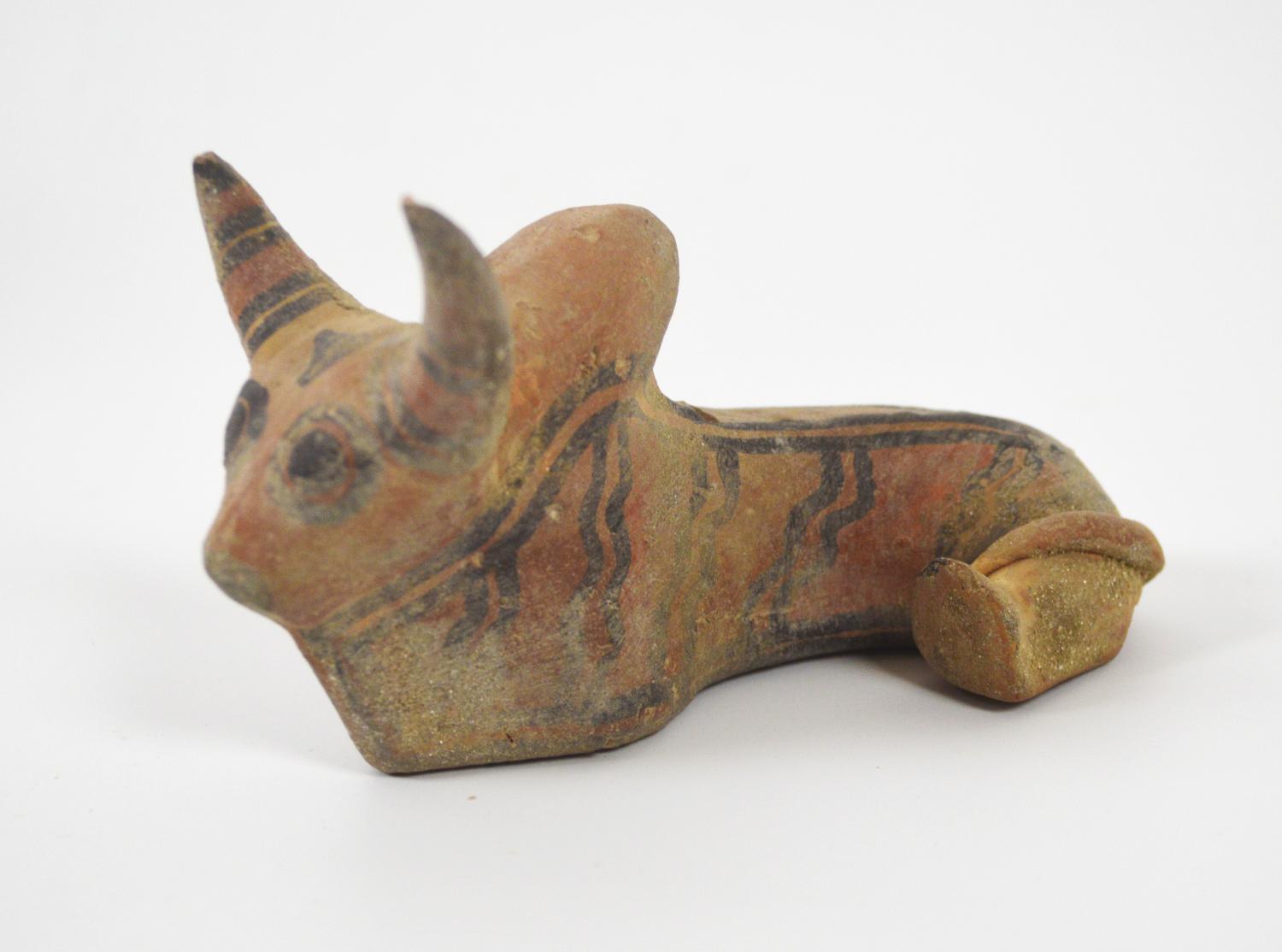 Statuetta raffigurante uno zebù accosciato, con la coda ripiegata, la testa eretta e le grandi corna arcuate; dipinto con coppie di linee in nero.