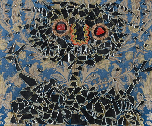 ENRICO BAJ Milano 31/10/1924 - Varese 15/06/2003  Personaggio allo specchio, 1971 tecnica mista e collage (specchi e passamaneria) su tappezzeria cm. 50x61, esemplare 11/100, firma e tiratura su etichetta dello Studio Marconi (MI) al retro, pubblicato su "Baj, catalogo dell'opera Grafica e Multipli", volume II, Edizioni Rousseau (Ginevra), pagina 100 al numero 31.