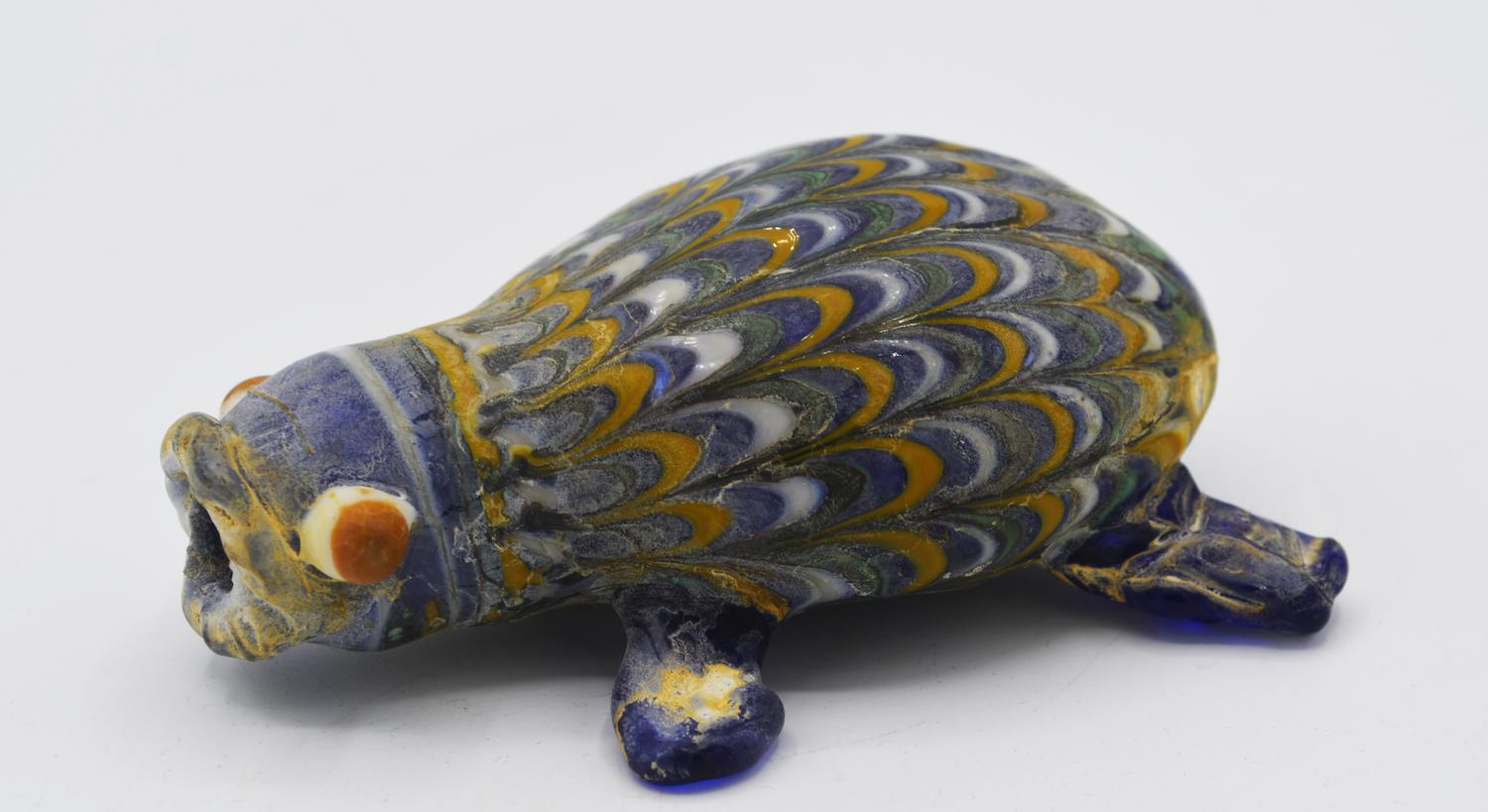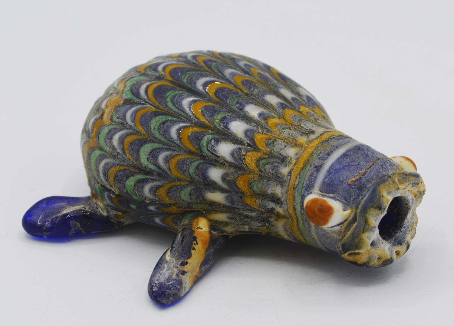 Unguentario modellato come un piccolo quadrupede con testa costituita dal bocchello, corpo arrotondato decorato a solcature, quattro piccoli arti.