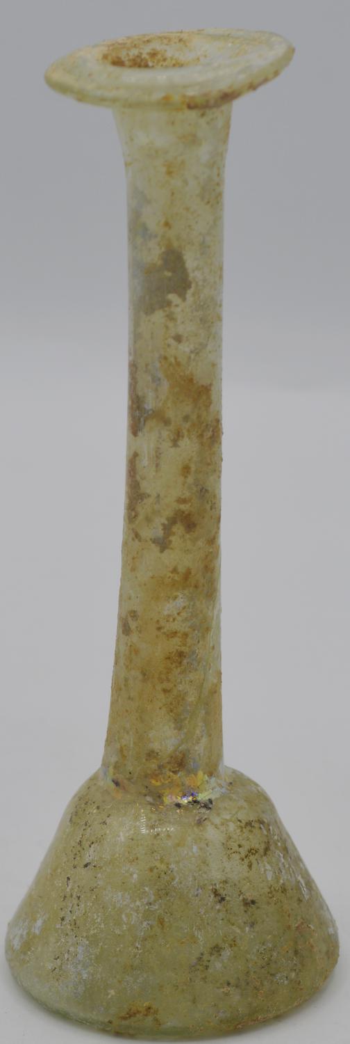 Unguentario con bocchello appiattito, lunghissimo collo cilindrico, corpo a bulbo, fondo piatto.