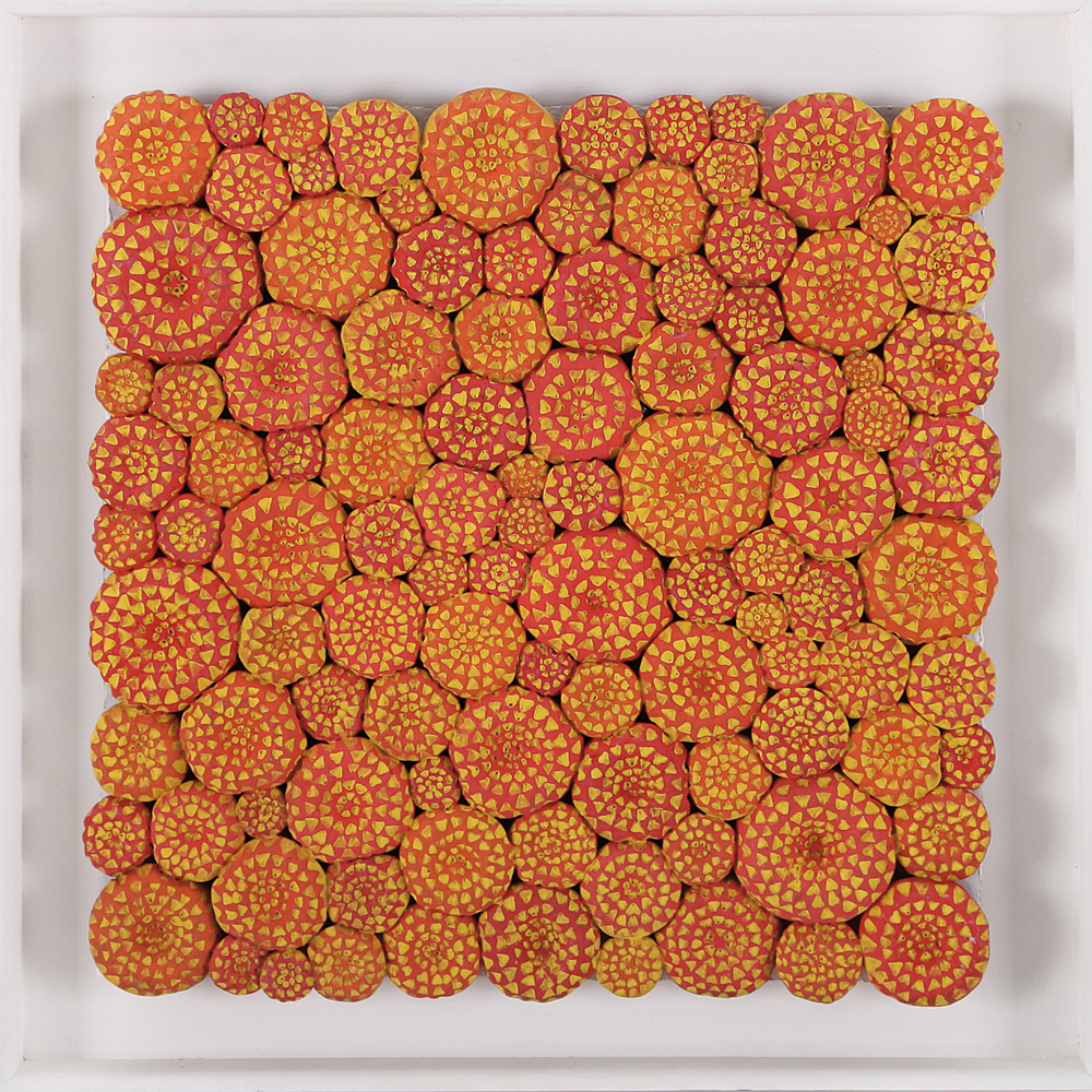 KAZUMASA MIZOKAMI Arita 1958 Scheggia della morte, 2001 scultura in terracotta policroma applicata su legno cm. 40x40, firma, titolo e anno al retro, dichiarazione d'autenticità dell'artista su foto.