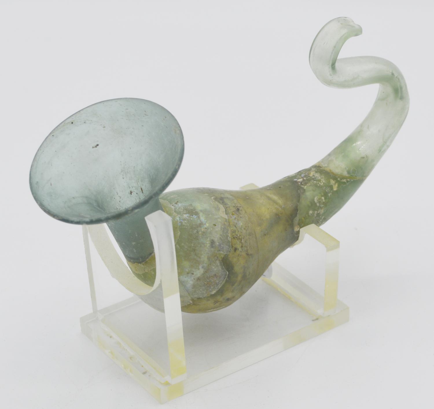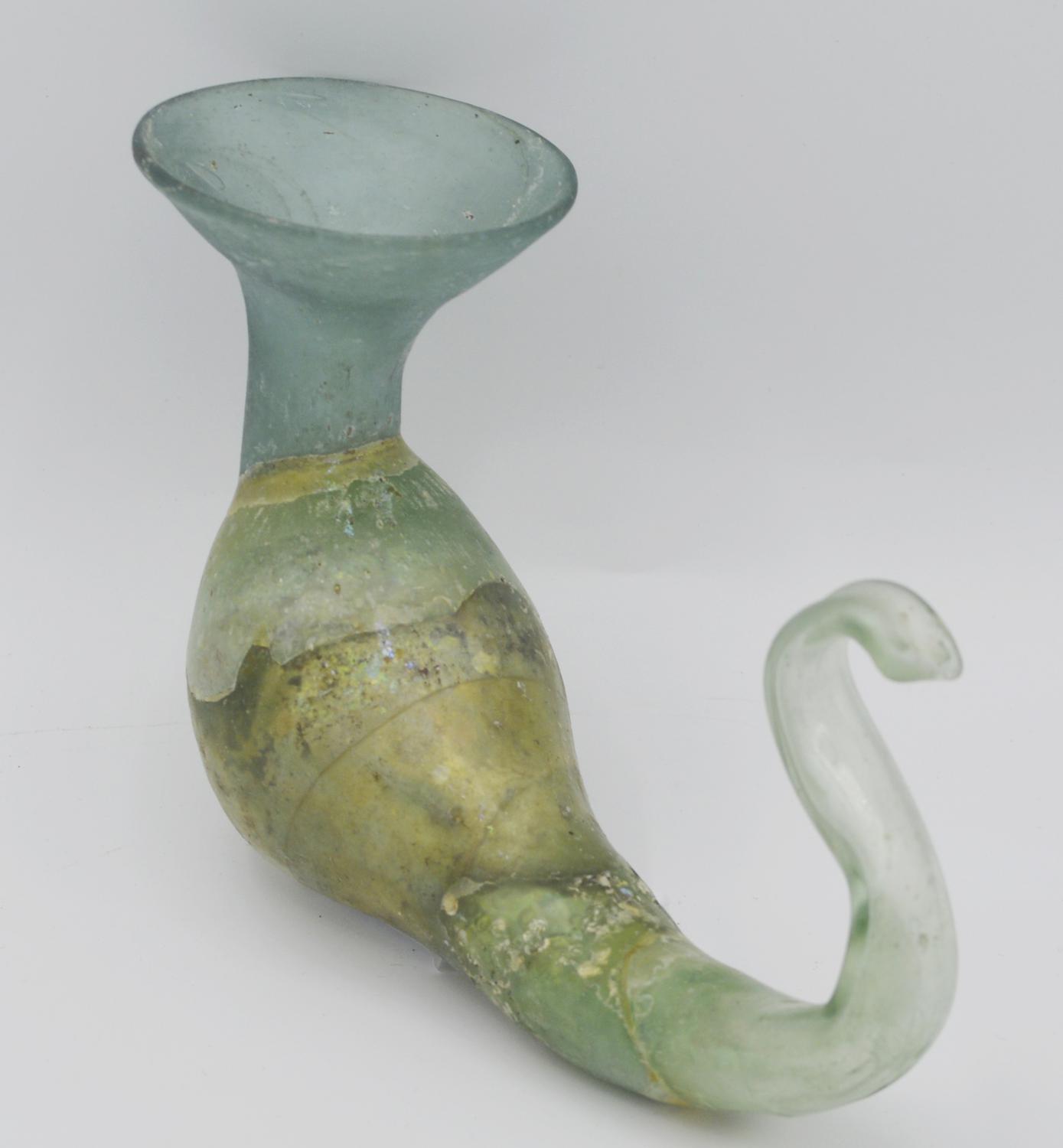Unguentario con ampio bocchello svasato, corpo a otre, estremità sinuosa.