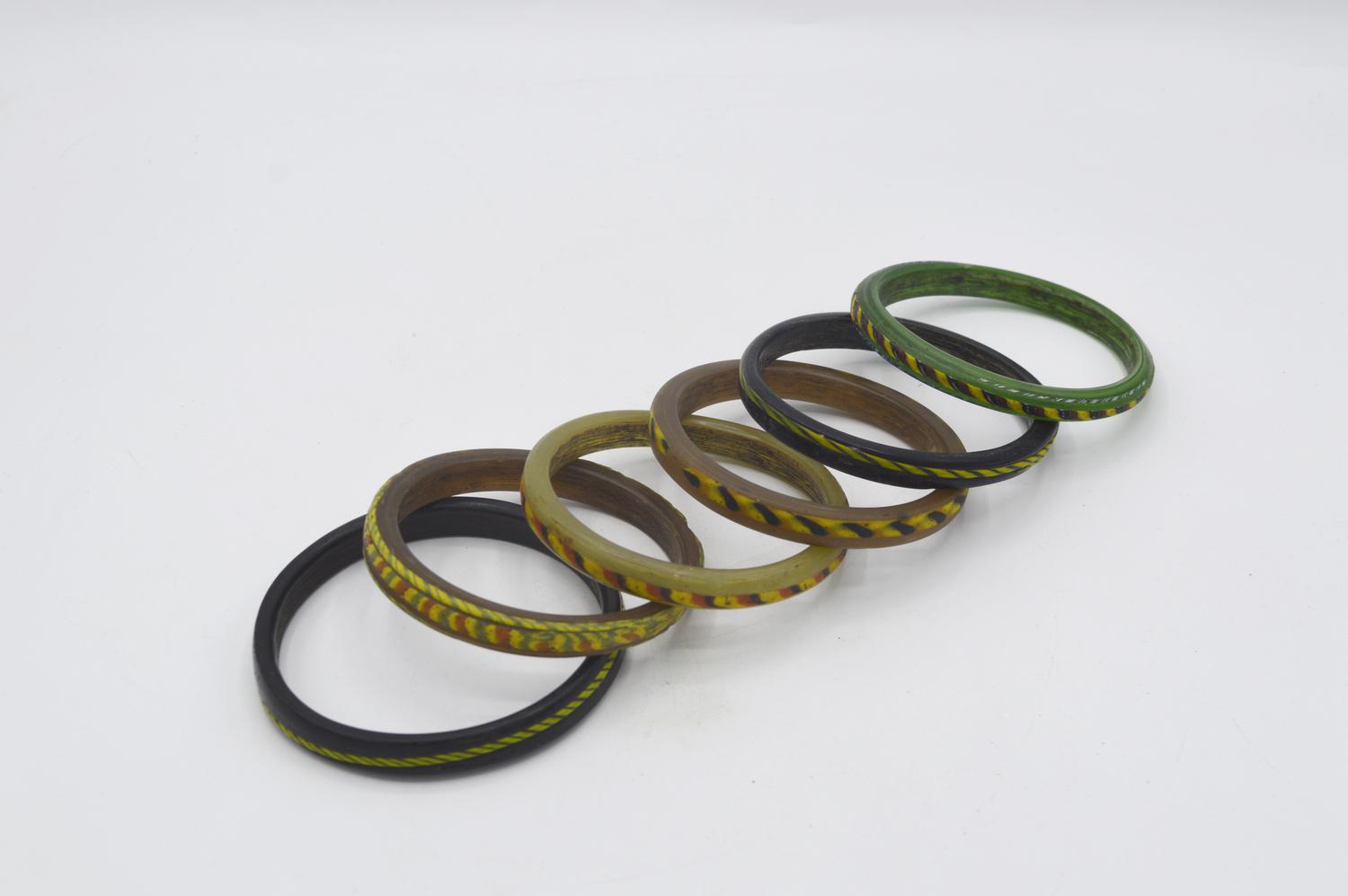 Sei armille vitree in differenti colori, decorate sul lato esterno ad intarsio di paste vitree in colori contrastanti.