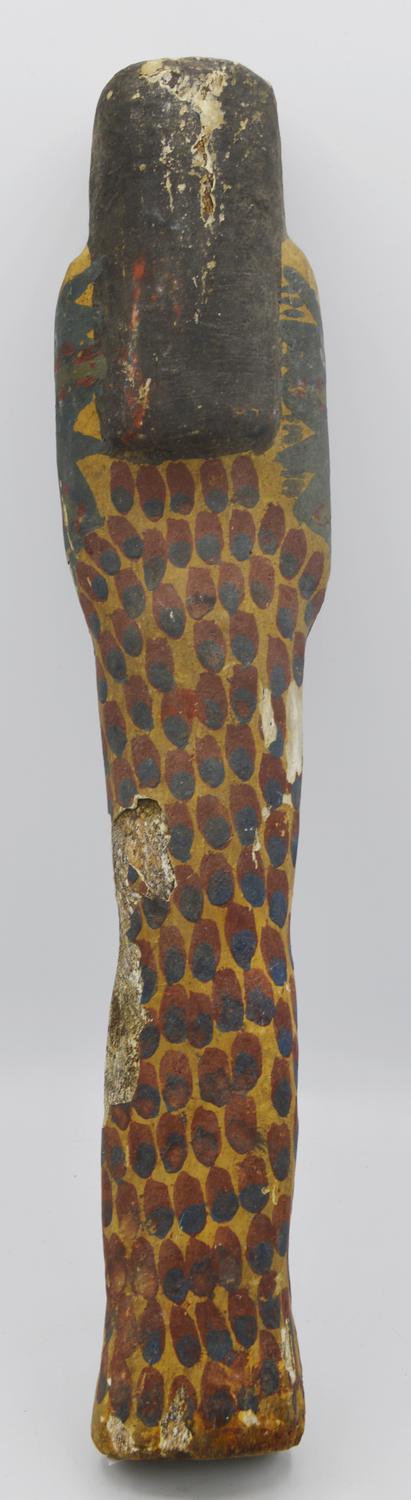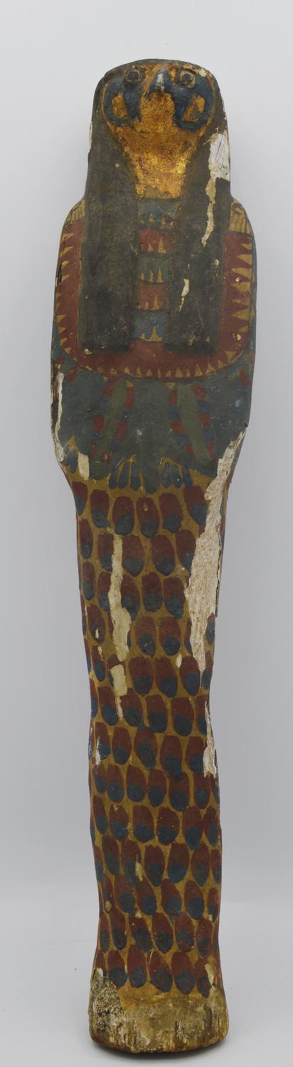 Figura mummiforme stilizzata con testa di falco; indossa una parrucca tripartita, la collana larga usekh ed ha il corpo dipinto a piume stilizzate in blu e rosso.