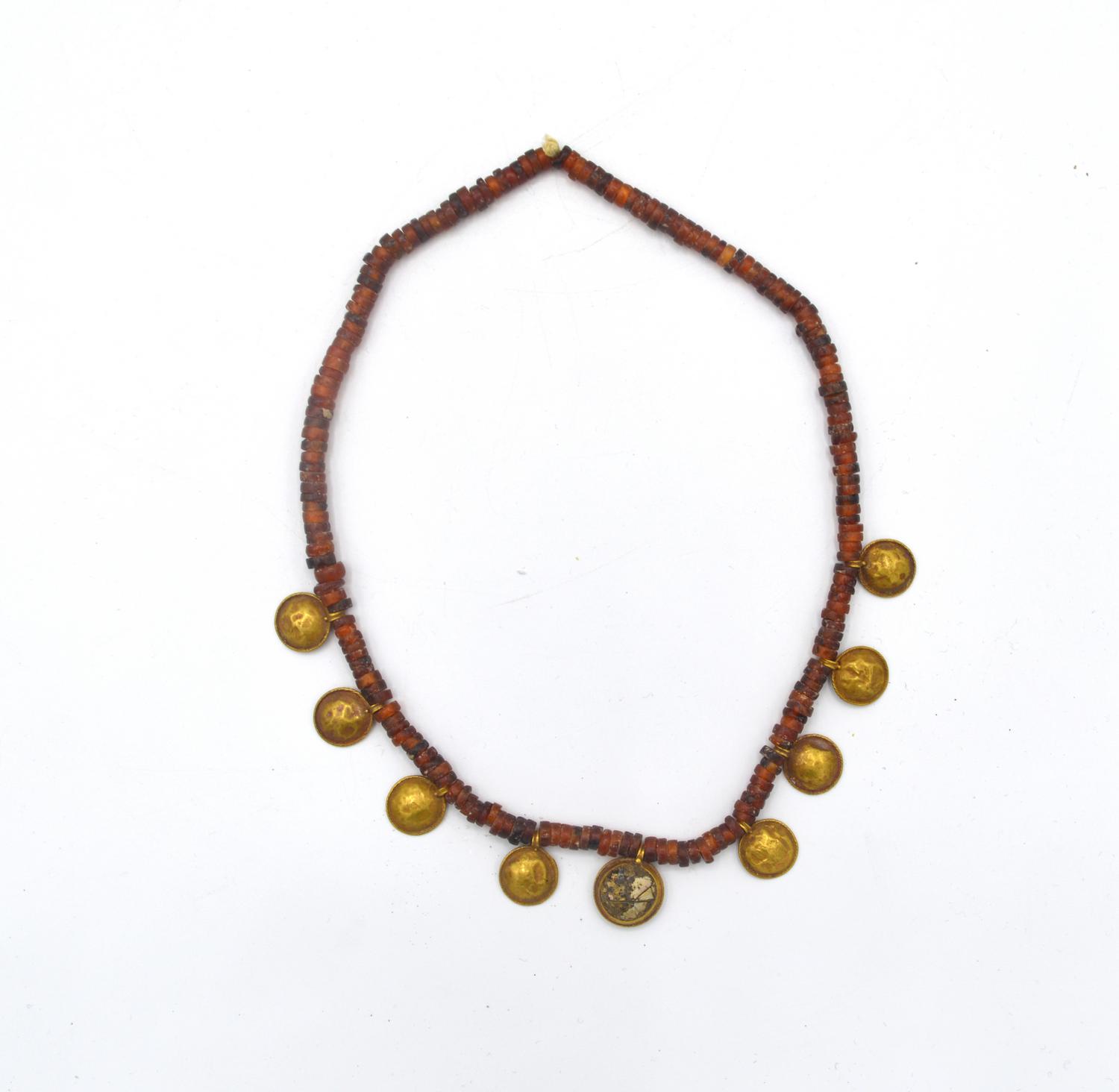 Collana formata da piccoli vaghi cilindrici in corniola con nove pendenti in lamina d'oro a scudo circolare.