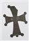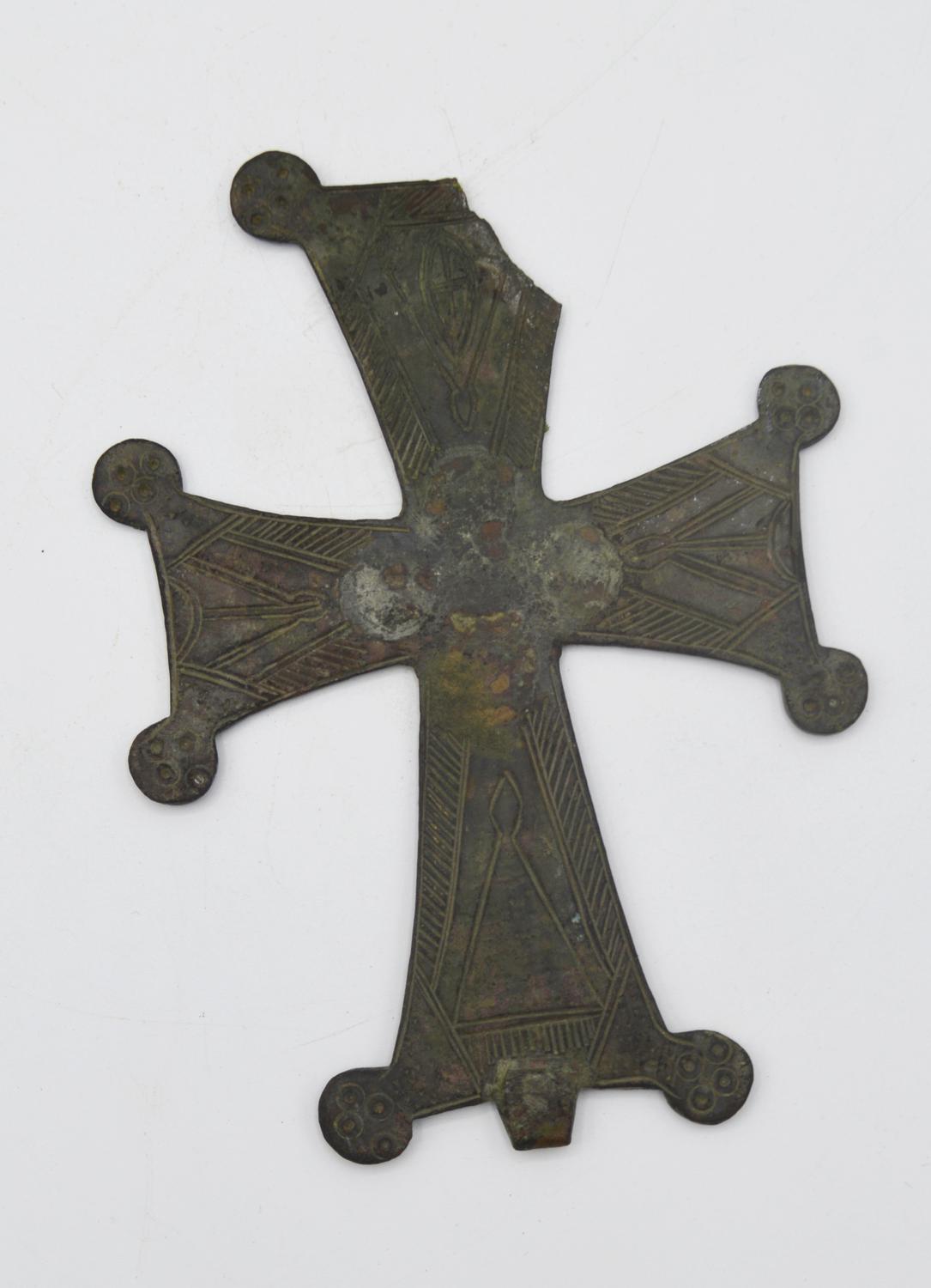 Croce in lamina di bronzo cesellata a motivi geometrici, ciascun braccio desinente in due elementi circolari; nella parte inferiore tracce di un attacco per un sostegno.