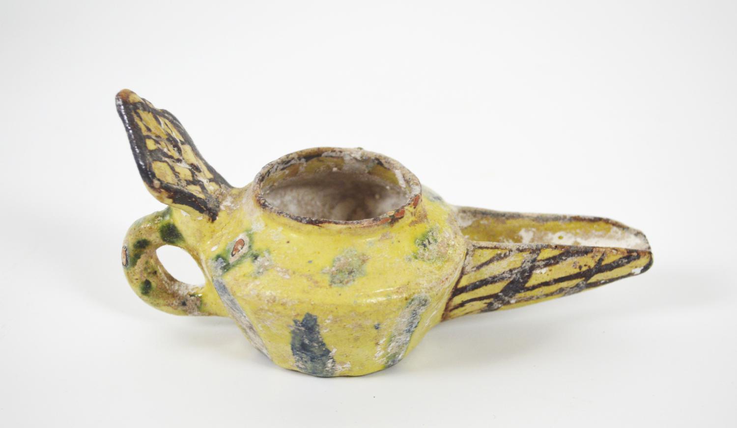 Lucerna con lungo becco, corpo biconico, fondo piatto, ansa ad anello; decorata ad invetriatura con smalti gialli e verdi