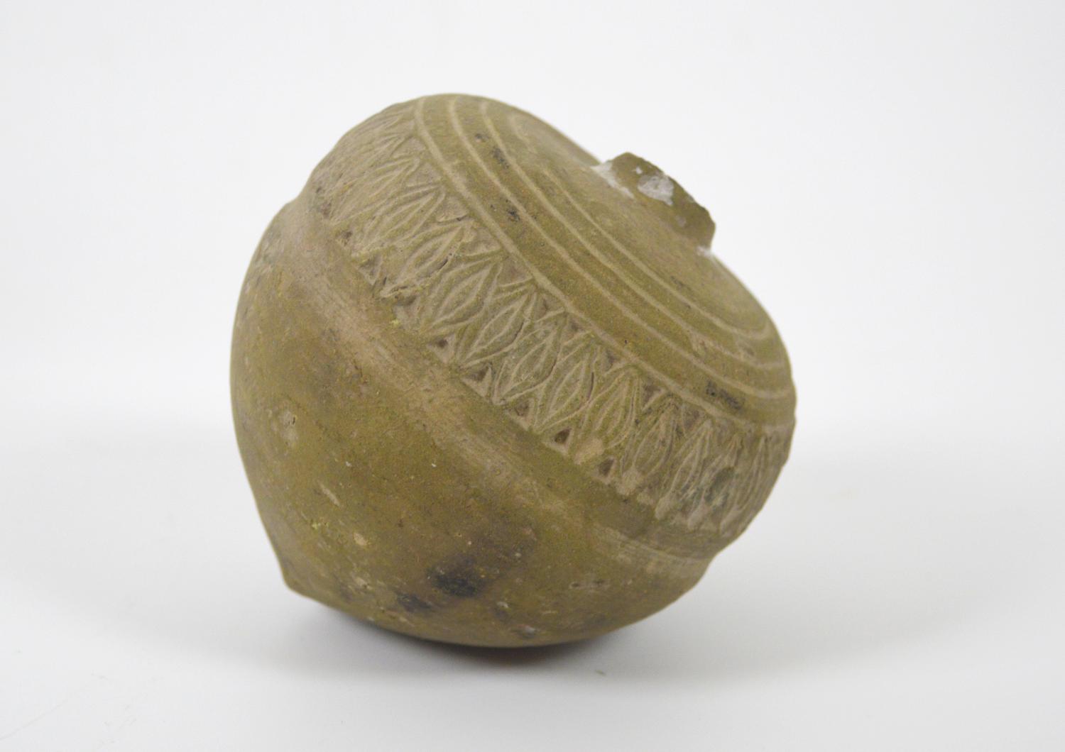 Granata incendiaria in terracotta, di forma globulare, a ricordare forse una melagrana; decorata con linee incise parallele ed un ampia fascia a motivi fitomorfi