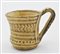 Tazza con labbro leggermente svasato, corpo cilindrico a profilo concavo, fondo piatto, ansa a nastro impostata verticalmente dall'orlo al ventre; decorata a linee parallele orizzontali intervallate da una fascia a chevrons ed un'altra a punti.
