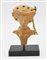 Parte superiore di una figurina di ?concubina del morto?, con volto triangolare fortemente stilizzato con doppia collana tubolare al collo e fori sul capo per la sospensione di trecce posticce ornate con perline di faience gialla e turchese. Due fori alle orecchie; busto filiforme con seni in evidenza
