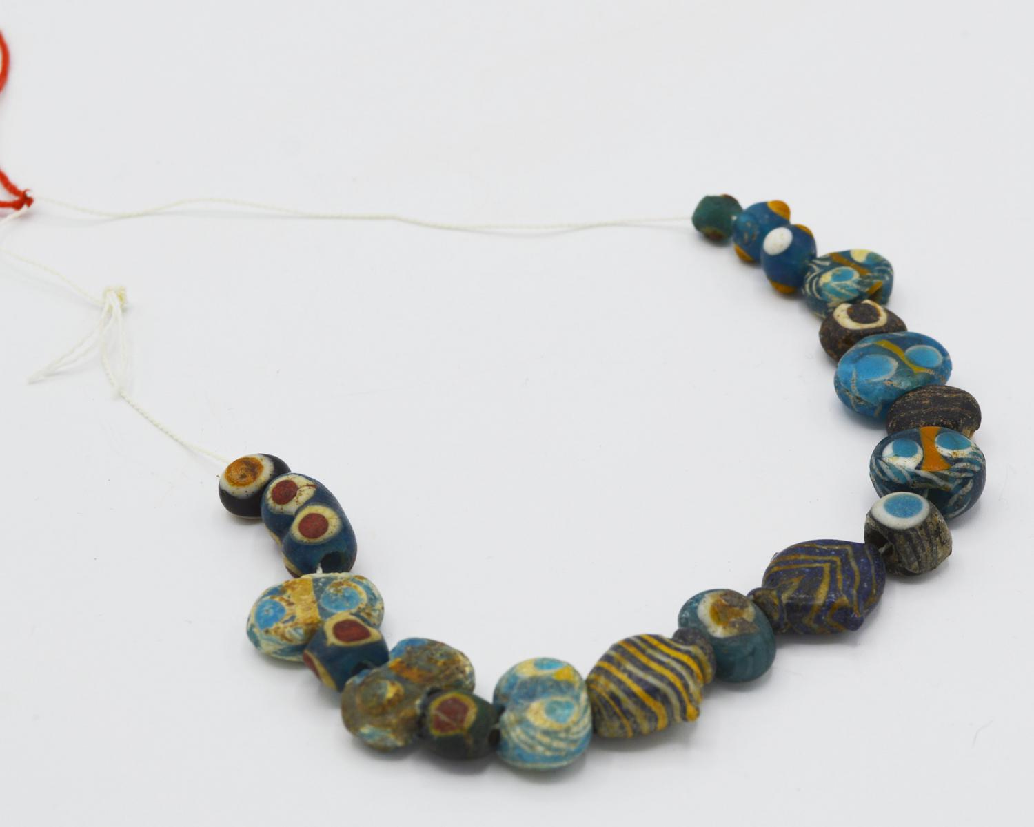 Collana composta da diciannove vaghi in pasta vitrea turchese e blu dei quali diciassette globulari con inserti a murrine ?a occhi? e due modellati come un pesce.