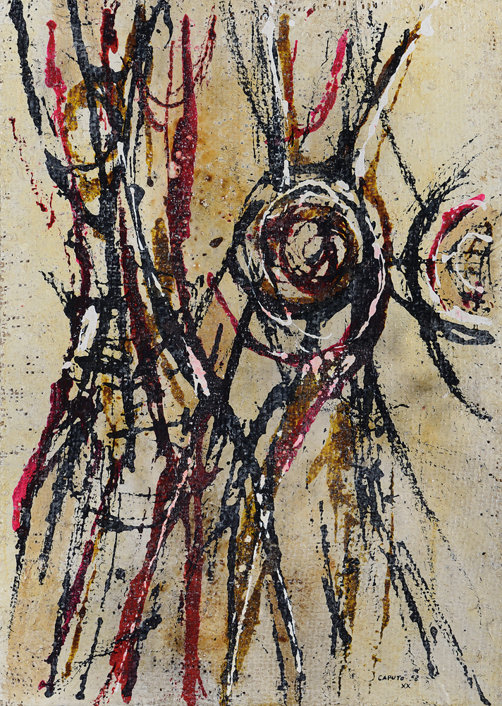 TONINO CAPUTO Lecce 14/05/1933 Senza titolo, 1958 olio su tela di juta cm. 70x50, firma e anno in basso a destra e al retro.