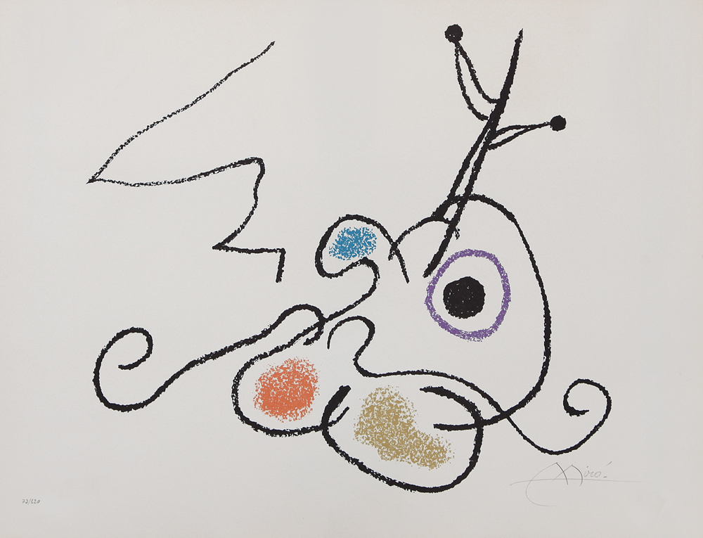 JOAN MIRO’ Montroig 1893 - Palma de Mallorca 1983 Ubu aux Baléares, 1974 litografia su carta cm. 50x64,8; esemplare 72/120, firma in basso a destra, pubblicata sul catalogo della mostra "Mirò Milano, Pittura, Scultura, Ceramica, Disegni, Sobreteixims, Grafica", Edizioni Mazzotta, tenutasi dal 27 ottobre al 6 dicembre 1981 presso la Rotonda di Via Besana (MI), pagina 238.