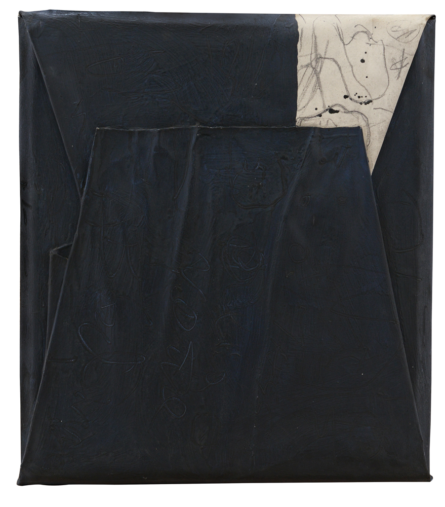 CESARE BERLINGERI Cittanova (Rc) 06/03/1948 Piegato alla notte, 2001 olio su tela cm. 71x63x8, firma, titolo e anno al retro, opera registrata presso l'Archivio Cesare Berlingeri a cura della Galleria Dante Vecchiato (PD) come da dichiarazione su foto, certificato della Telemarket allegato, opera priva di cornice.