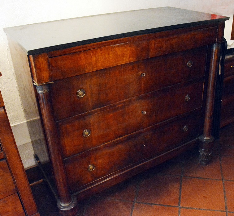 Cassettone Impero impiallacciato in noce a colonna intera con specchiera e piano in marmo verde