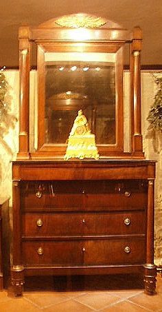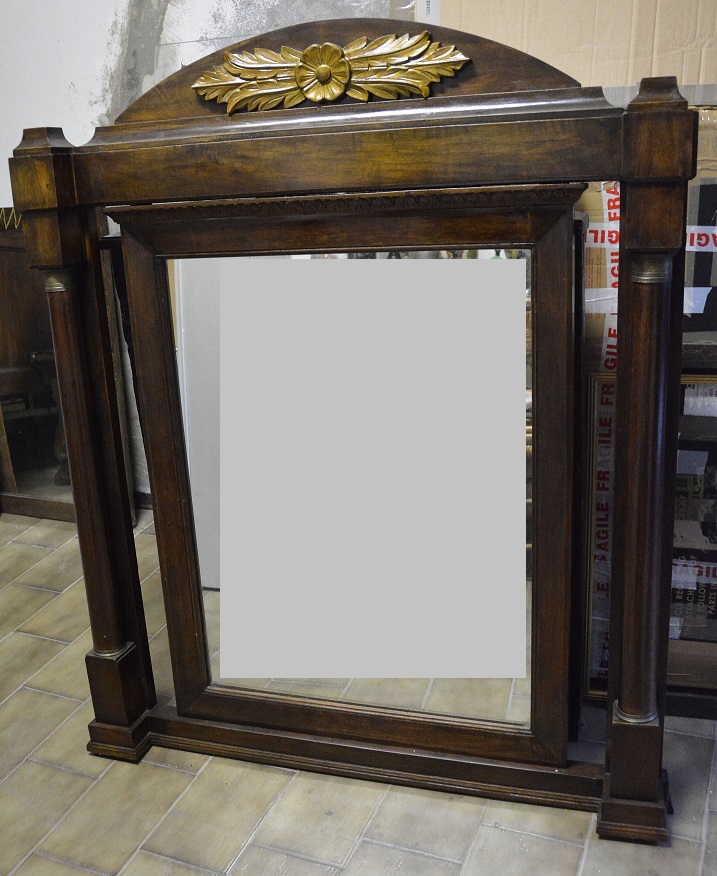 Cassettone Impero impiallacciato in noce a colonna intera con specchiera e...