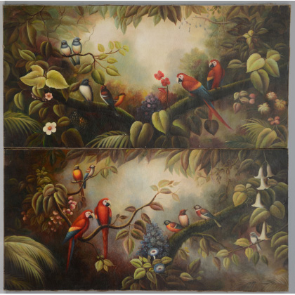 Coppia di antichi dipinti ad olio su tela a tema di volatili cm.60x120...