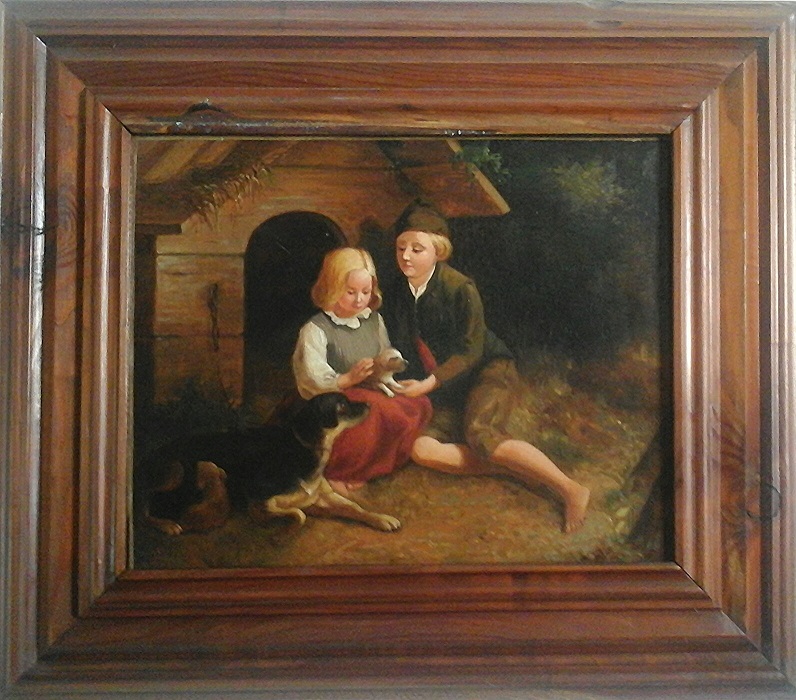 Coppia di dipinti con bambini e animali cm.40x50, reintelo