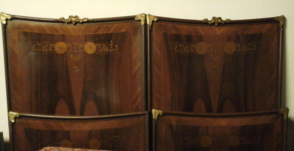 Coppia letti deco' in metallo dipinti a finto legno con decorazioni e applicazioni in bronzo dorato
