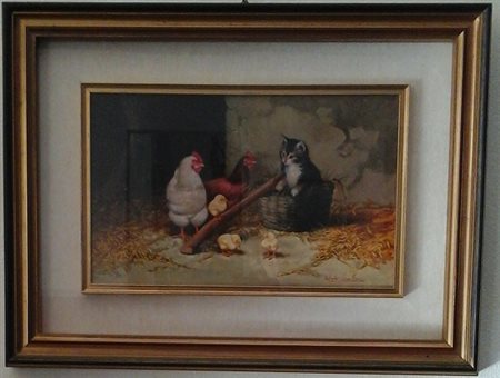 Alfredo Santini - Bassa corte con gattino - Olio su tavola cm.25x40 - firmato...