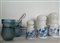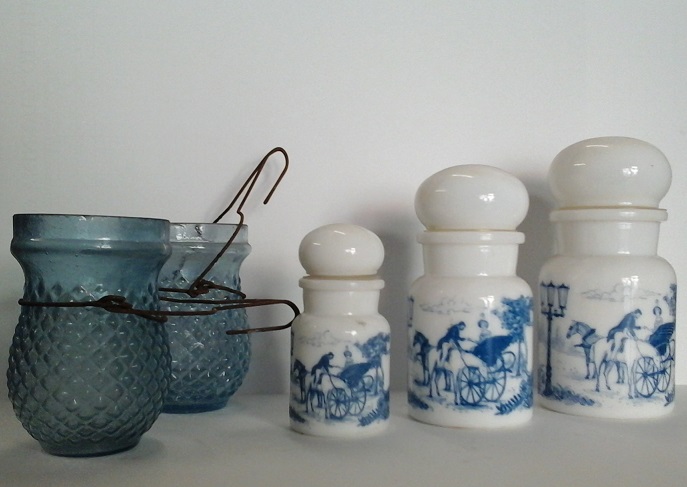 Tre vasetti in vetro opalino decorato e due coppette in vetro azzurro