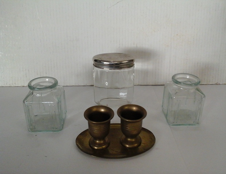 Tre vasetti in vetro di cui uno con coperchio argentato e due vasetti in bronzo con vassoio