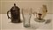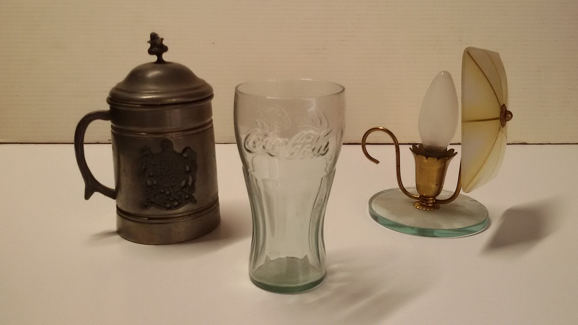Un boccale in peltro con stemma, una abat-jour e un bicchiere Coca Cola
