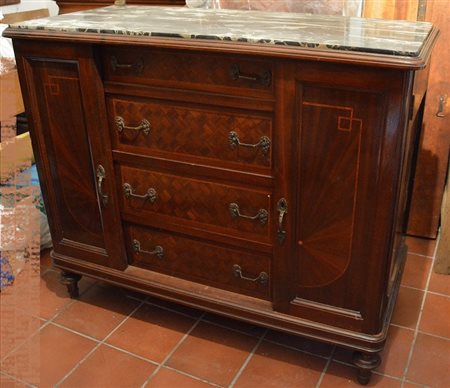 Mobile a due ante e quattro cassetti lastronato in mogano e filettato, piano in marmo e specchiera cm.125x56x104 - difetti