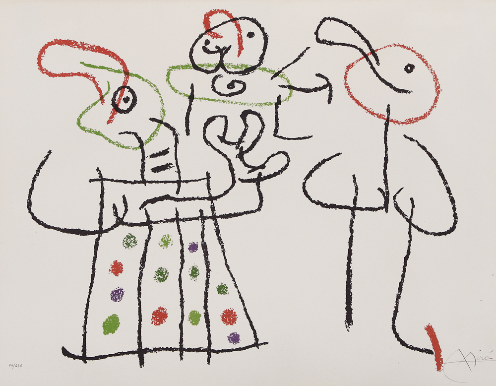 JOAN MIRO’ Montroig 1893 - Palma de Mallorca 1983 Ubu aux Baléares, 1974 litografia su carta cm. 50x64,8; esemplare 74/120, firma in basso a destra, pubblicata sul catalogo della mostra "Mirò Milano, Pittura, Scultura, Ceramica, Disegni, Sobreteixims, Grafica", Edizioni Mazzotta, tenutasi dal 27 ottobre al 6 dicembre 1981 presso la Rotonda di Via Besana (MI), pagina 238.
