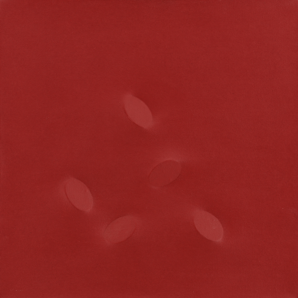 TURI SIMETI Alcamo 05/08/1929 Cinque ovali rossi, 1996 acrilico su tela estroflessa rossa cm. 50x50, firma e anno al retro, opera registrata presso l'Archivio Turi Simeti come da dichiarazione su foto, opera priva di cornice.