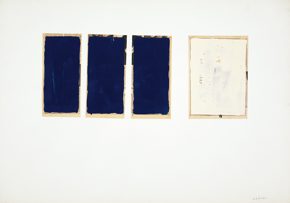 MARIO SCHIFANO Homs (Libia) 1934 - Roma 26/01/1998 Senza titolo, 1967-69 smalto e collage su carta intelata cm. 70x100, firma in basso a destra, opera registrata presso l'Archivio della Fondazione Mario Schifano (Roma) al numero 67-69/43 come da dichiarazione su foto e su certificato allegato, opera registrata presso l'Archivio Mario Schifano (Roma) al numero 01919110409 come da dichiarazione con foto allegata, pubblicato su "Studio metodologico riguardante la catalogazione informatica dei dati relativi alle opere di Mario Schifano presenti presso la Fondazione M.S. Multistudio", volume IV°, opere su carta 1955-1998, pagina 51, repertorio 67-69/043.