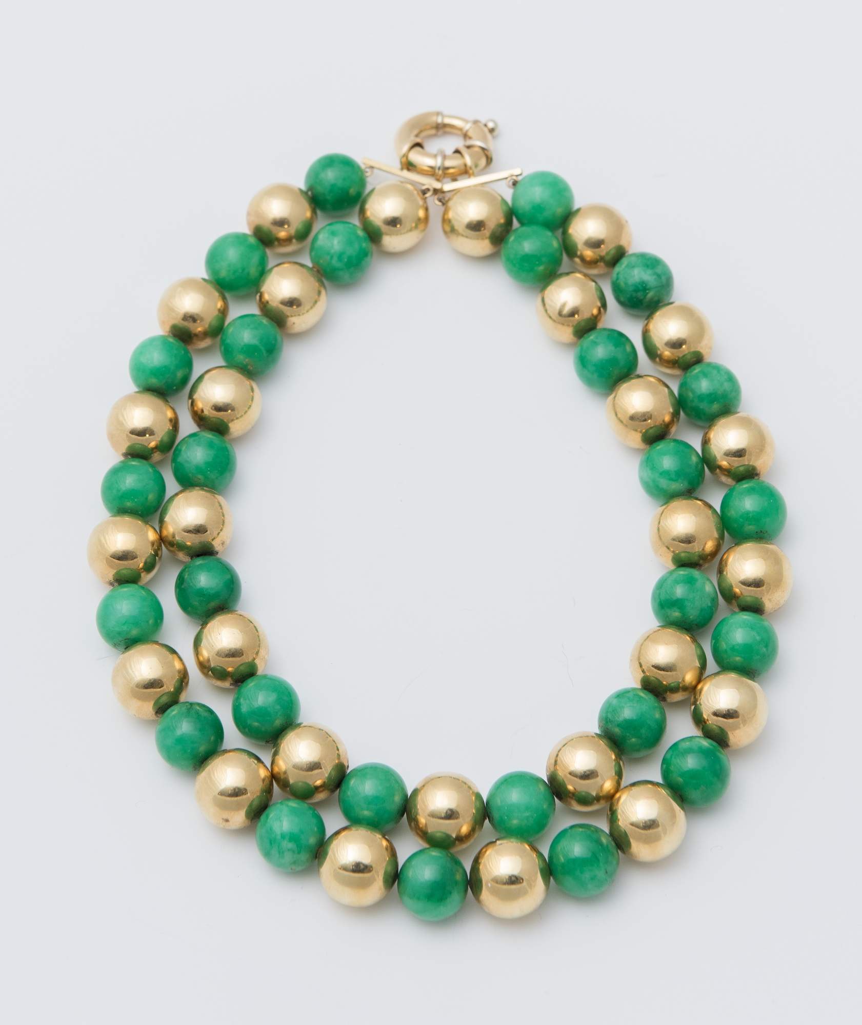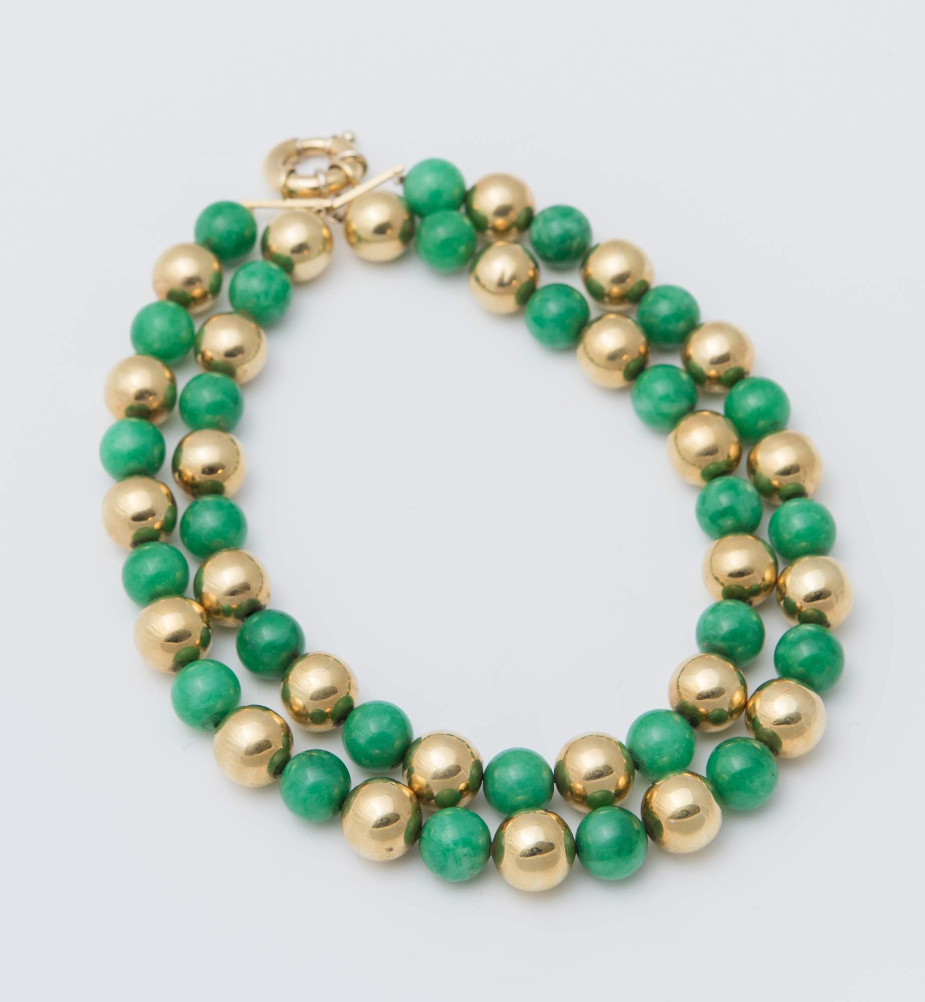 COLLANA IN ORO E BOULES VERDI. Lunga collana a boules alternate in pietra dura verde e oro 18K. Peso: 205 grammi.