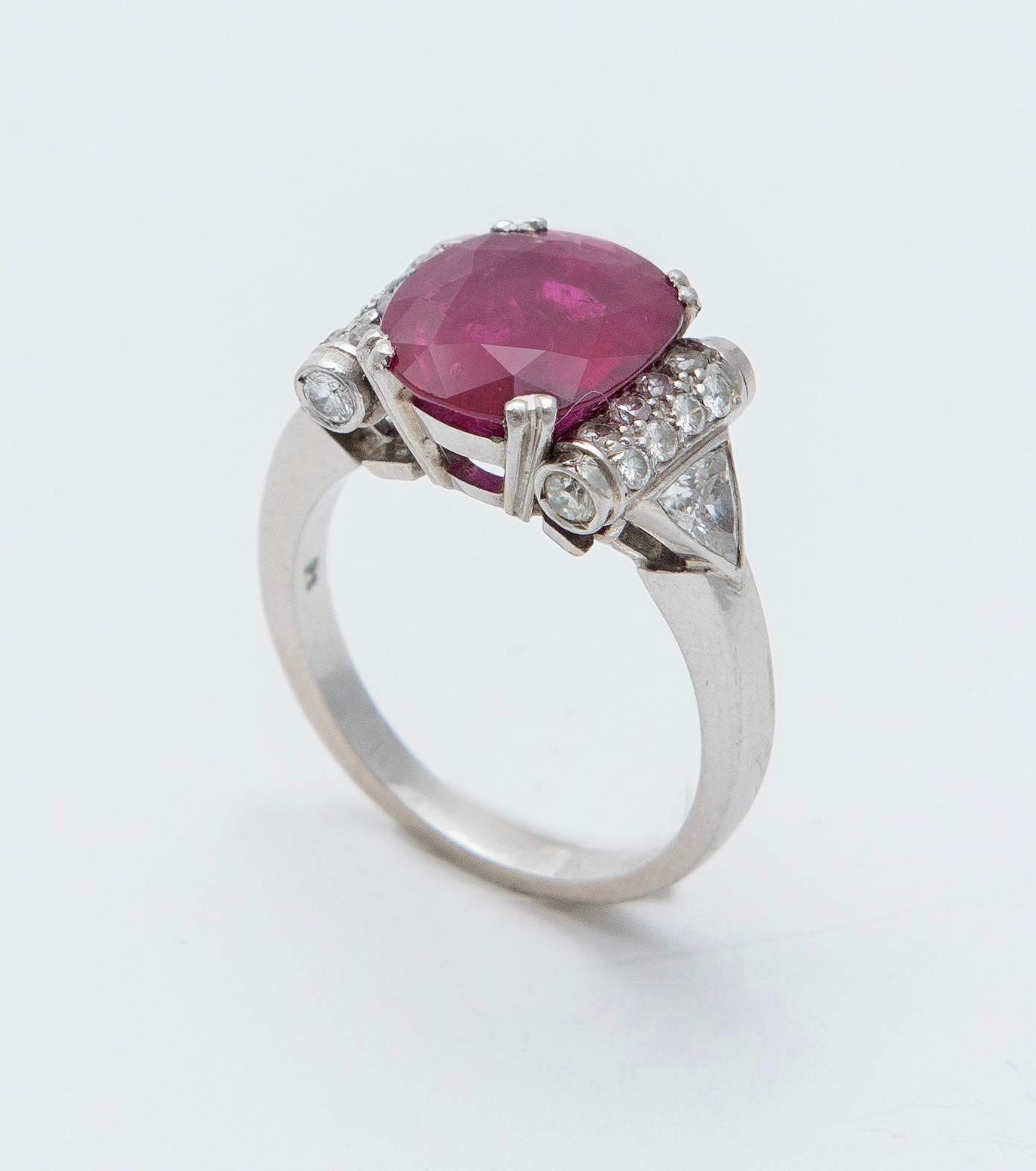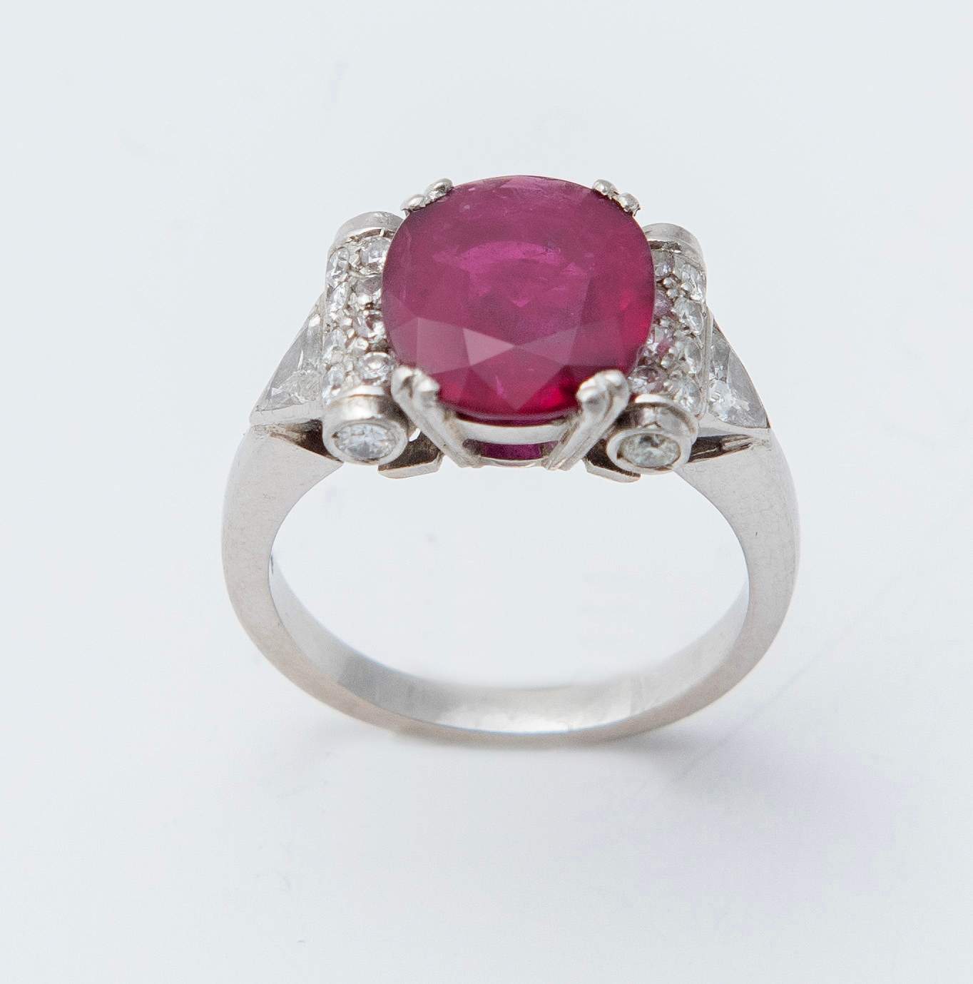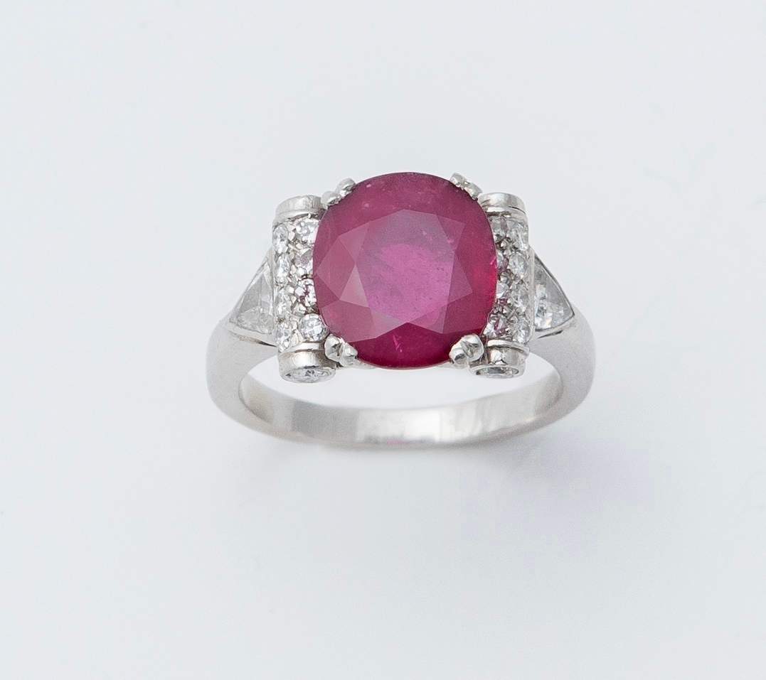 ANELLO CON RUBINO E DIAMANTI in platino, centrato da grande rubino ovale affiancato da diamanti triangolari e rotondi. Il rubino ha un peso stimato di 3,30 ct, non evidenzia indicazioni di riscaldamento e dimostra probabile origine Thailandia-Siam. Peso complessivo 7,91 grammi.