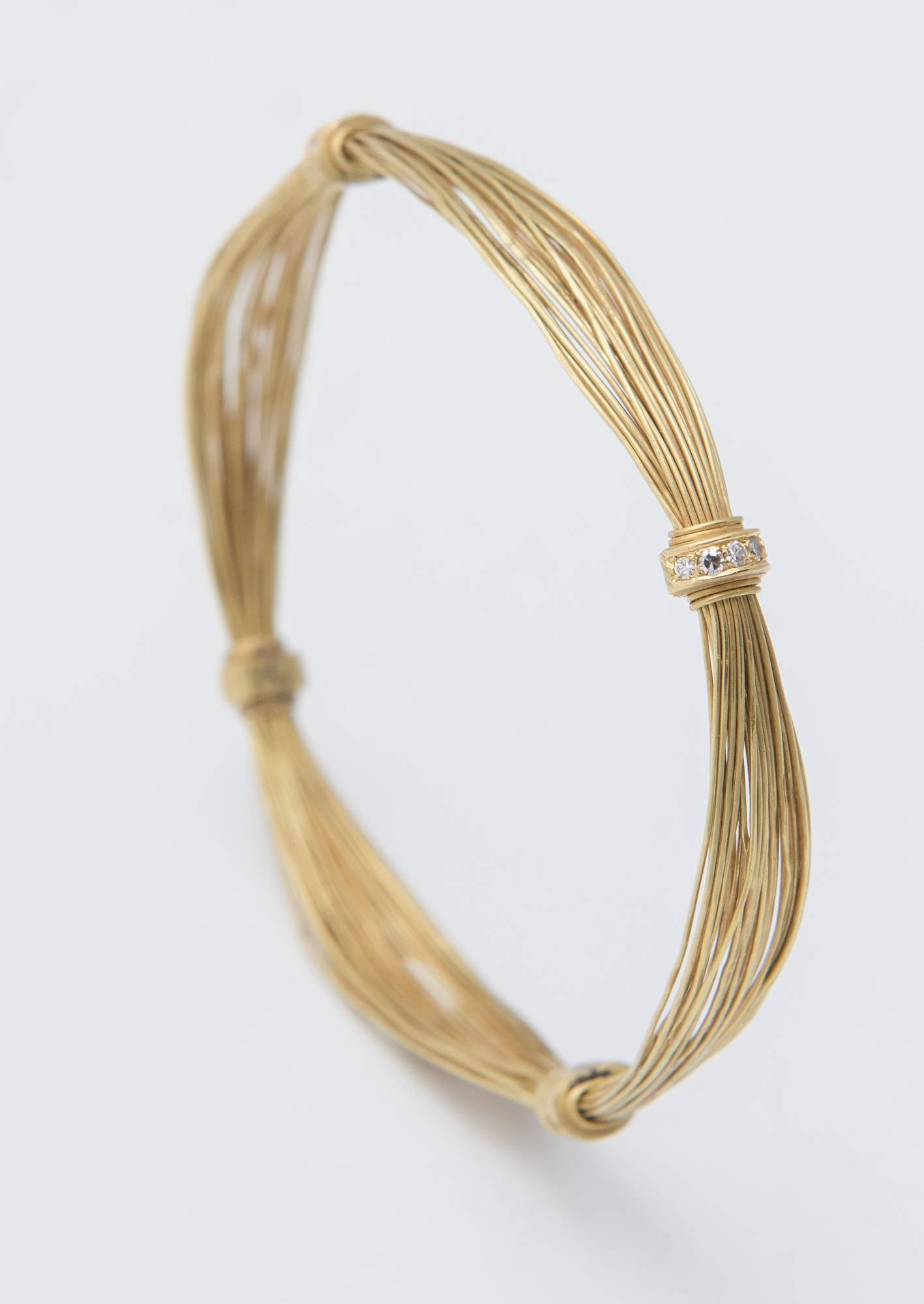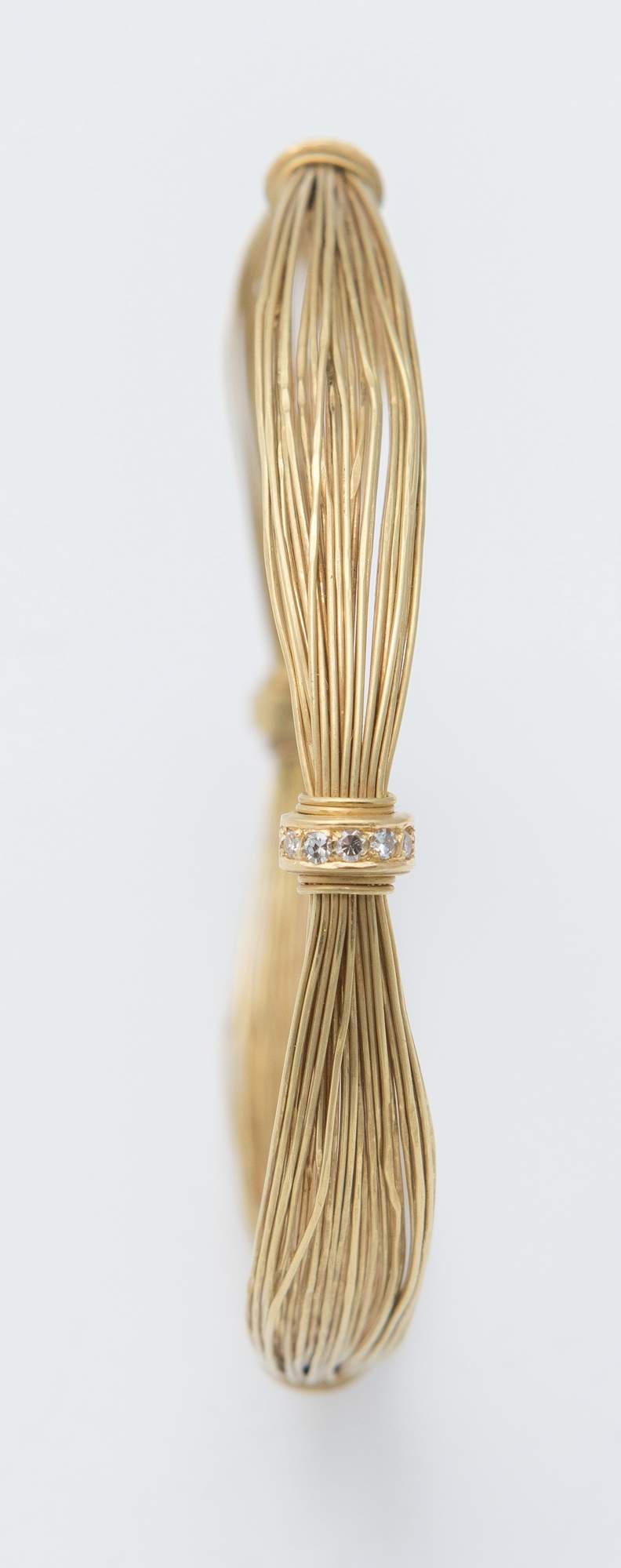 BRACCIALE IN ORO GIALLO E DIAMANTI en suite con gli orecchini lotto 40. Realizzato come un cerchio rigido a millefili in oro giallo 18K intercalato da elementi in diamanti (peso stimato 0.55 ct). Peso complessivo 24,54 grammi. Gioiello ad opera dell'artista Francesco Brunetti. Gioiello esposto nella mostra "Il racconto della materia", Palazzo Garagnani, Crespellano di Valsamoggia, 22 settembre - 23 ottobre 2016. Gioiello pubblicato nel catalogo "Francesco Brunetti, il racconto della materia", 2016, pag. 88.