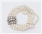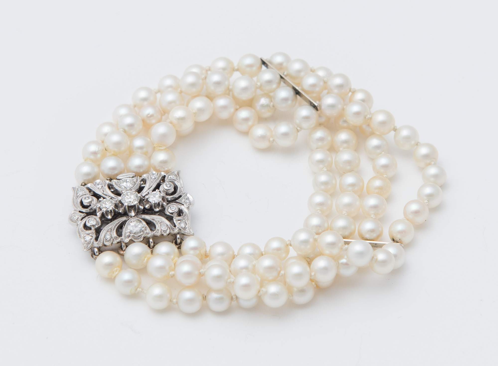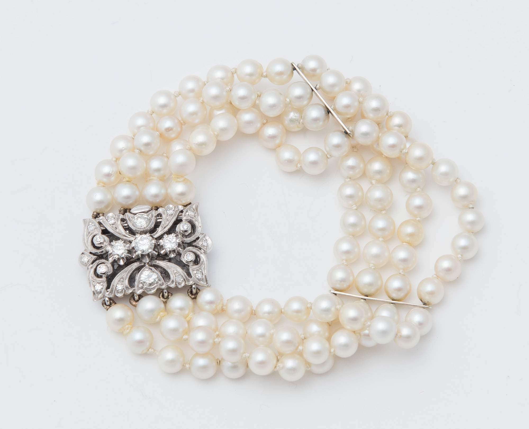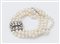 BRACCIALE A QUATTRO FILI DI PERLE COLTIVATE realizzato a quattro fili di perle coltivate, sferiche, di acqua salata, diametro 5 – 5 ½, con fermezza in oro bianco 18K decorata con diamanti. Quattro diamanti di taglio a brillante per un peso stimato di 0.65 ct e numerosi piccoli diamanti di taglio huit-huit. Peso complessivo: 34,39 grammi.