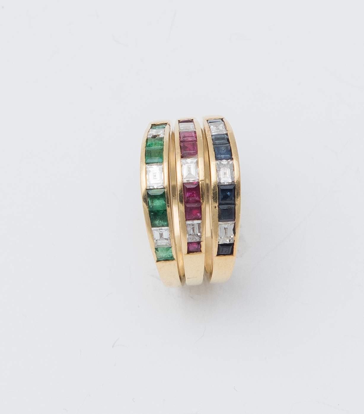 TRE FEDINE CON DIAMANTI, RUBINI, ZAFFIRI E SMERALDI In oro giallo 18K, con baguette di diamanti, rubini, zaffiri e smeraldi. Diamanti per un peso stimato indicativo di 0.50 ct. Peso complessivo 11,56 grammi.