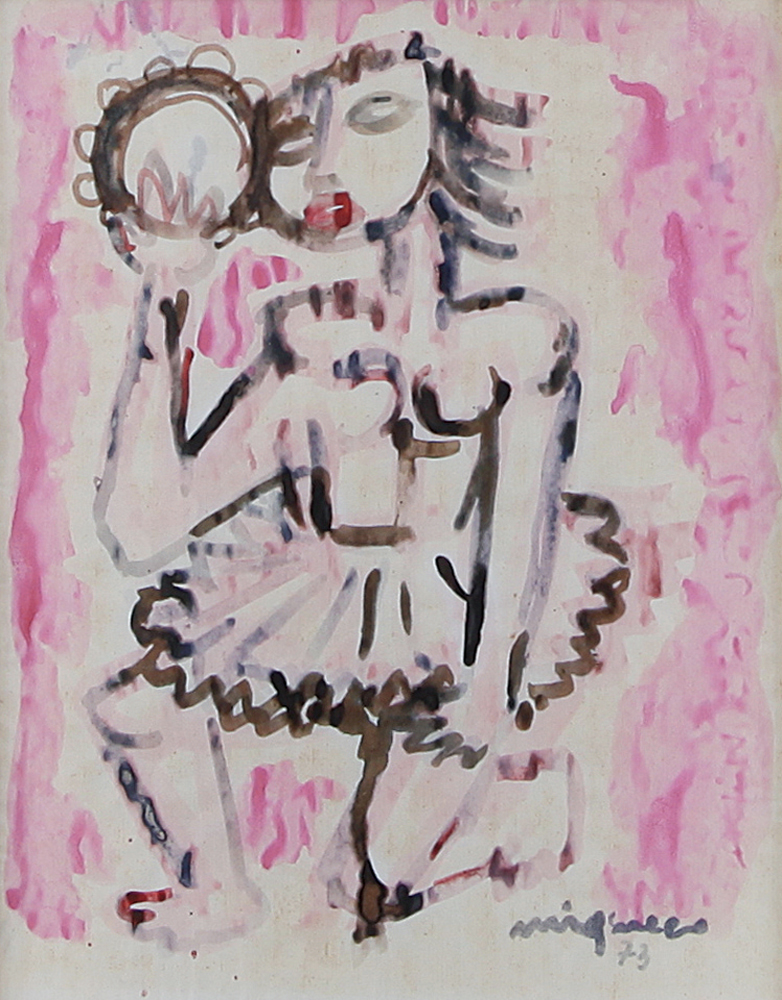GIUSEPPE MIGNECO Messina 09/02/1908 - Milano 28/02/1997  Figura con tamburello, 1973 china colorata su carta cm. 27,5x21,5; firma e anno in basso a destra.
