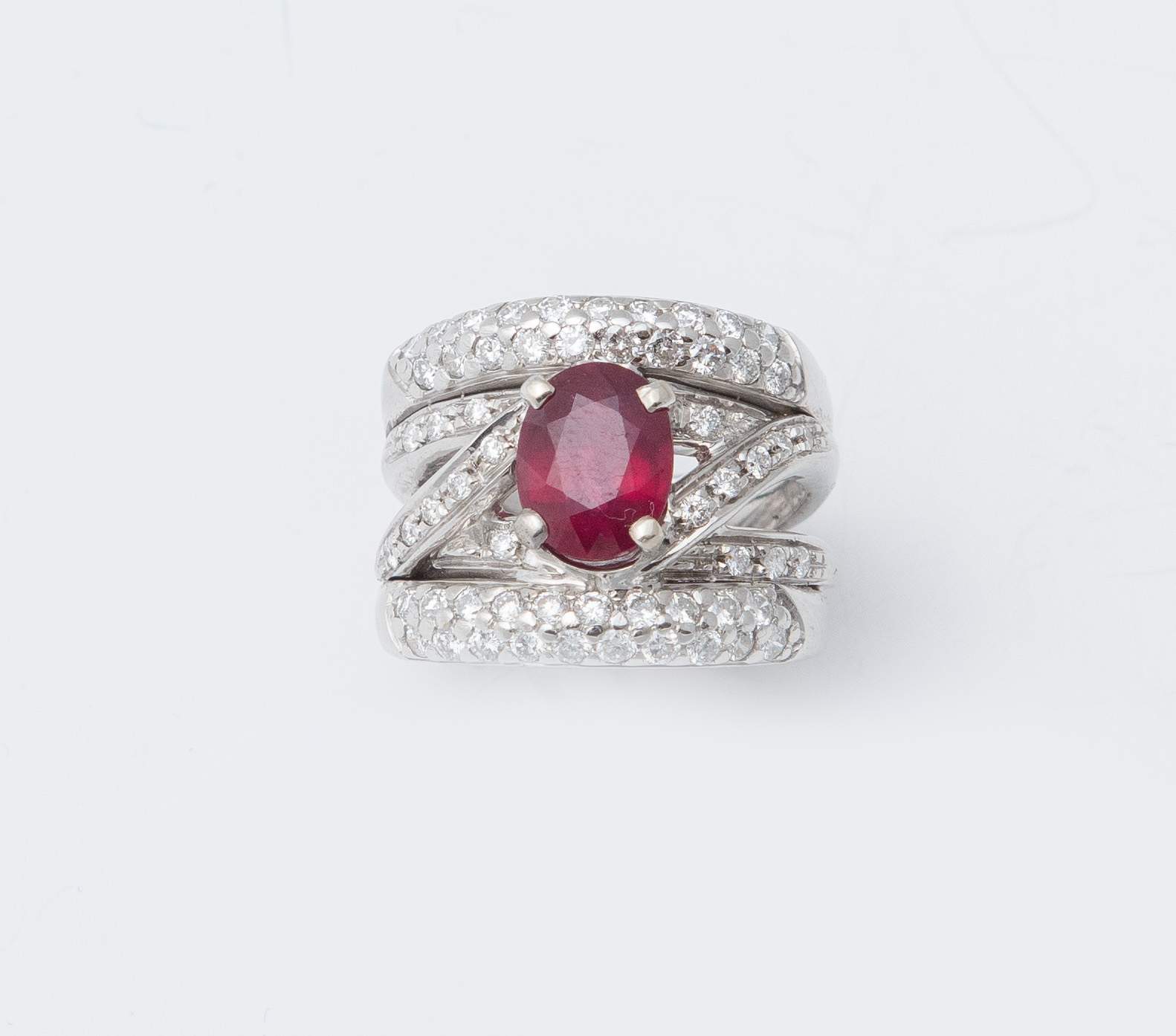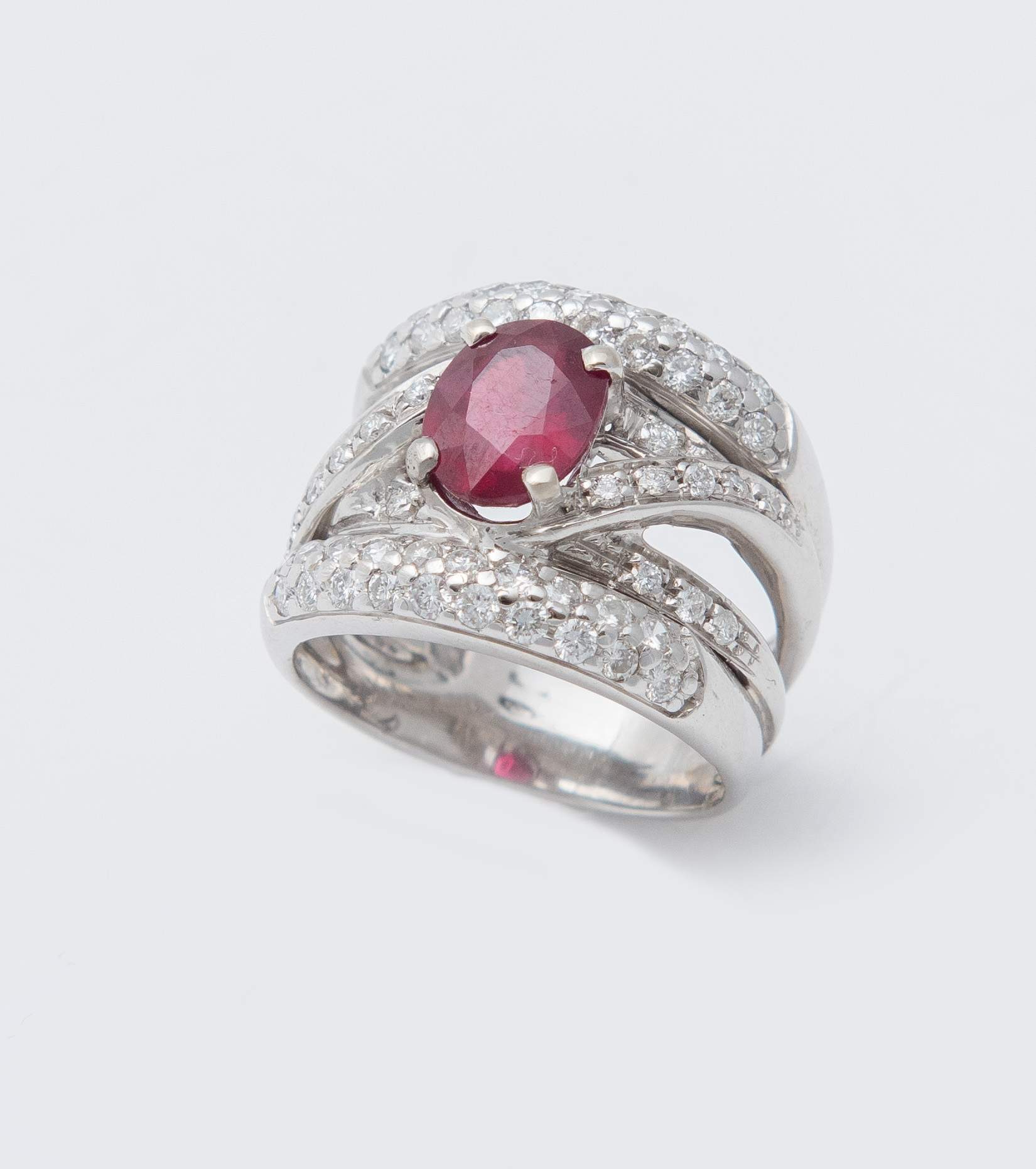 ANELLO CON RUBINO E DIAMANTI in oro bianco 18K, disegnato come una fascia fittamente decorata a pavé di brillanti centrata da rubino sfaccettato ovale (indicazioni di trattamento). Peso complessivo 11,62 grammi.