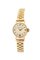 Cassa in oro con fondello a pressione. Quadrante beige con indici geometrici applicati e numeri arabi ai quarti. Bracciale in oro integrato a maglie e chiusura a scomparsa
