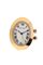 Sveglia da viaggio con cassa ovale placcata oro. Quadrante bianco con numeri romani e minuteria a binario chiusa serigrafati.