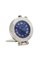 Sveglia da viaggio con cassa in acciaio con protezione del quadrante a cerniera che funge da piedistallo. Quadrante blu con numeri romani e minuteria a binario serigrafati