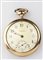 Cassa in metallo, laminata oro; quadrante in smalto bianco con numeri arabi, secondi al 6