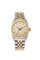 Cassa in acciaio con fondello a vite, lunetta in oro godronata. Quadrante argento con finitura soleil, indici geometrici applicati ed indicazione centrale dei secondi continui. Bracciale integrato in acciaio ed oro con chiusura clasp.