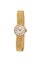 Cassa in oro con fondello a pressione. Quadrante argento con finitura soleil ed indici geometrici applicati. Bracciale in oro integrato con finitura maglia Milano.